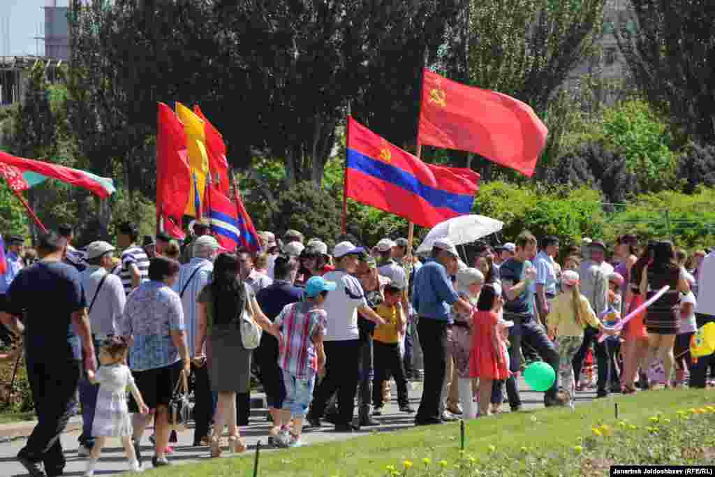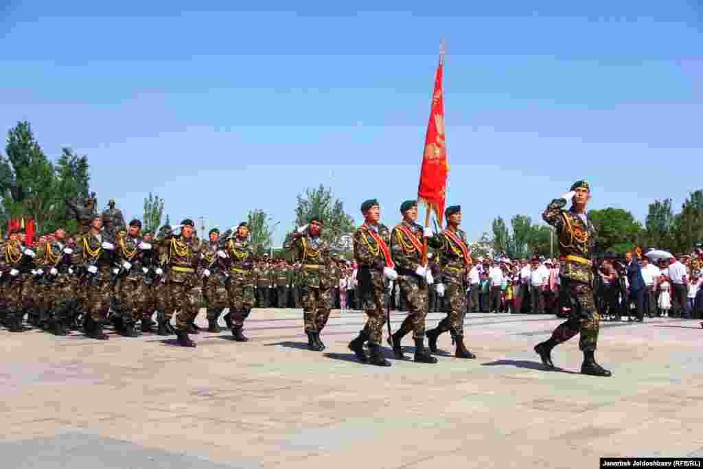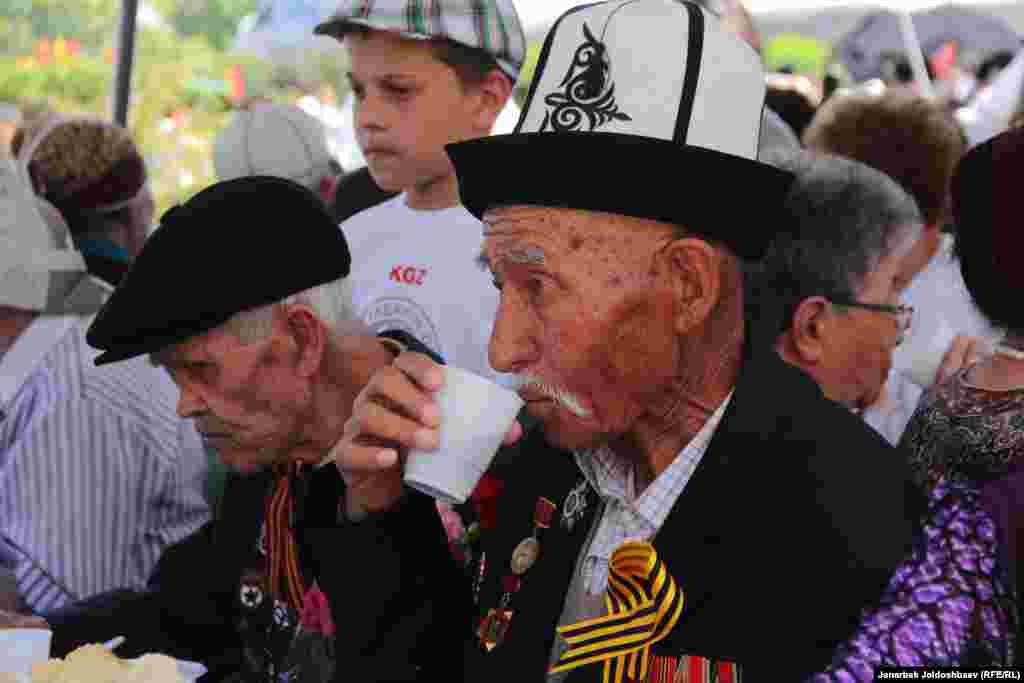 Сегодня в Бишкеке состоялось праздничное мероприятие, приуроченное ко Дню Победы. Ветеранов почтили праздничным обедом и традиционными фронтовыми 100 граммами. Кроме того, на площади Победы был организован небольшой парад военных и выступления артистов.